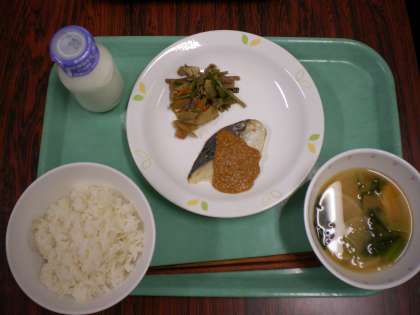 麦ごはん・魚のゴマだれかけ・茎ワカメの金平・みそ汁