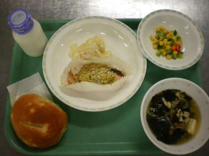 パインパン・魚のガーリック焼・じゃがいものクリーム煮・カラフルサラダ・わかめスープ