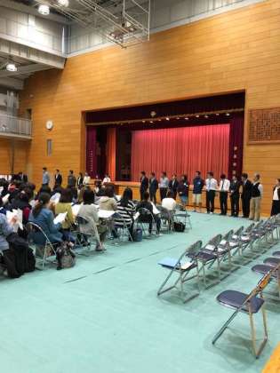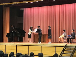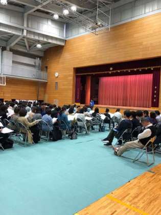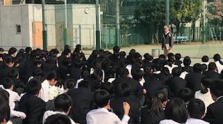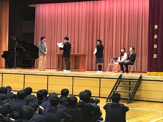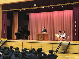 五人の先生が烏山中を去られました。お二方の先生が、お仕事の関係で欠席され残念ですが、三人の先生方からお別れのお話をしていただきました。