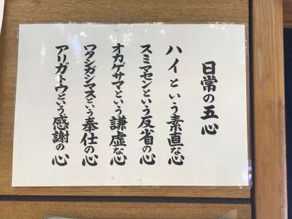 写真のように「日常の五心」が体育館に掲示されています。皆が、このような気持ちで毎日を過ごせたらいいなあと思います。