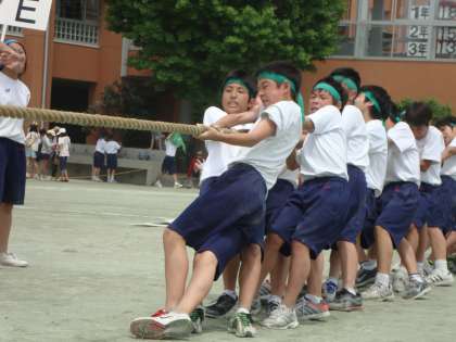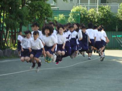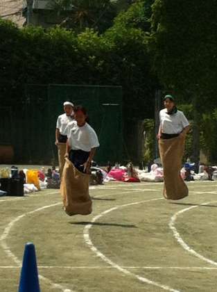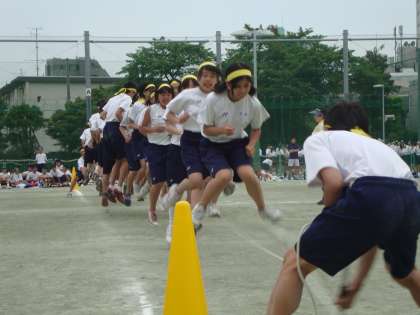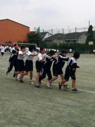 26日(土)の体育大会にむけて、予行を行っています。写真は、1年生の障害物競争です。