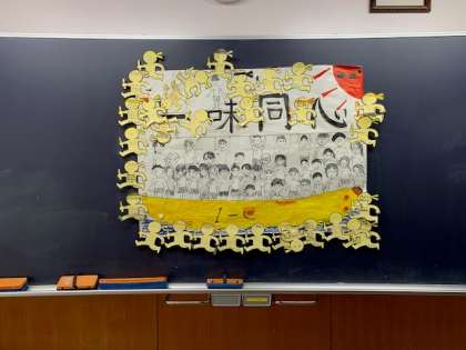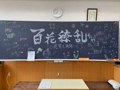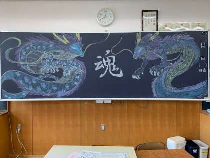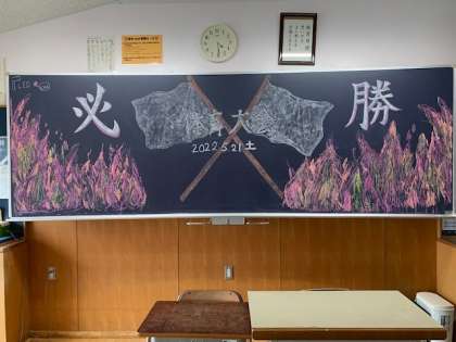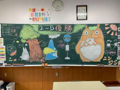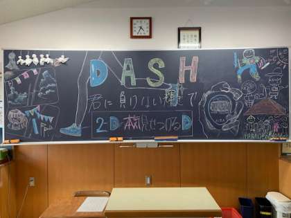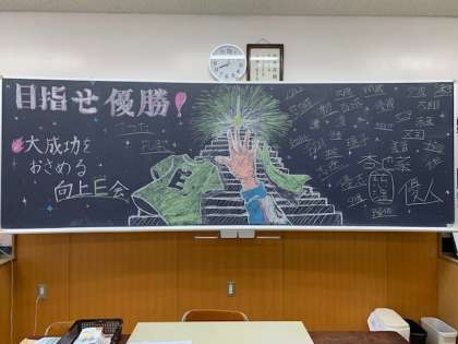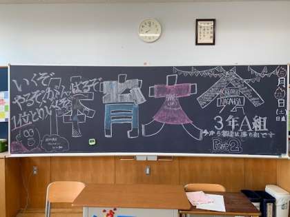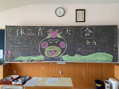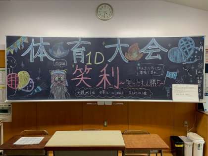 体育大会に向けた思いを、各クラス工夫を凝らし黒板に描いていました。まずは、1年生の黒板アート。