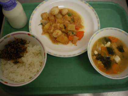 ごはん・かみかみ佃煮・じゃがいものそぼろ煮・豆腐とわかめの味噌汁