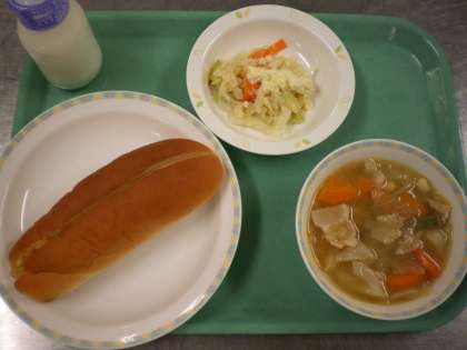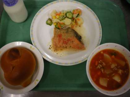 黒砂糖パン・魚のラビゴットソース・ポテト入りフレンチサラダ・ミネストローネ