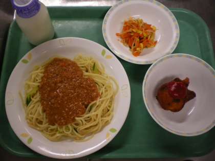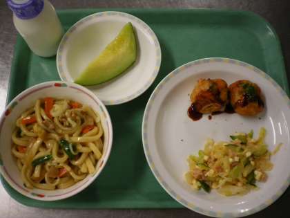 カレーうどん・たこあげ・ハムチーズサラダ・メロン