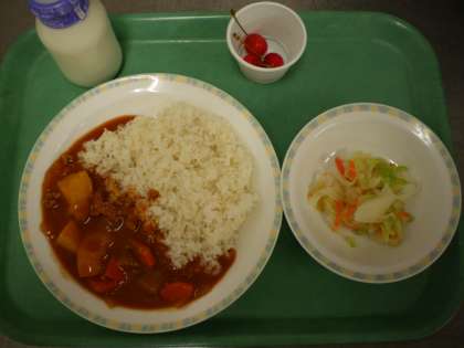 ハッシュドポークライス・キャベツサラダ・さくらんぼ