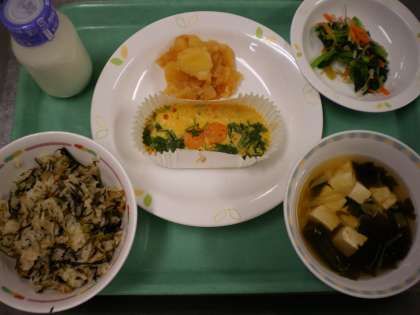 磯おこわ・千草焼・じゃがいもの甘辛煮・青菜のお浸し・すまし汁