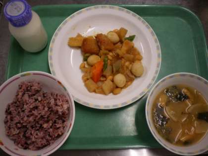 雑穀ご飯・豆入り筑前煮・大根と青菜のみそ汁