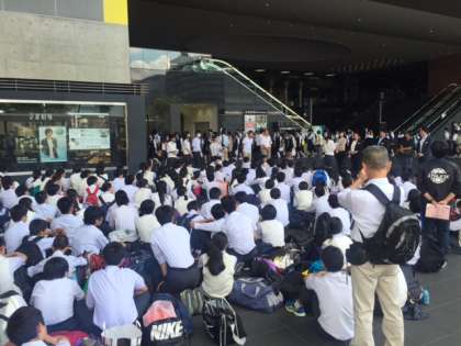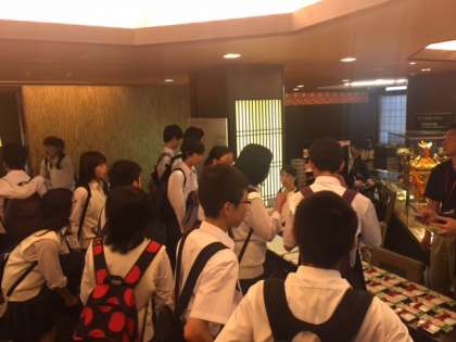 京都出発式。添乗員さん、写真屋さん、看護師さんへの御礼を代表者が話しているところです。班行動では、だいぶ太陽の日差しが強かったです。