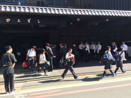 2日目、班行動。雨は、少し心配ですが、今のところ傘はささずに行けそうです。チェックを受けてスタート。