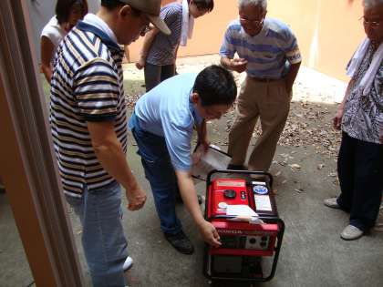 ※ 写真は、発電機を回して夜間の際の電球をつける訓練です。 -