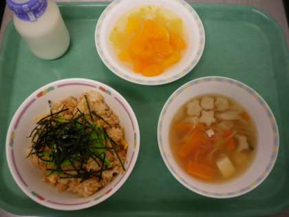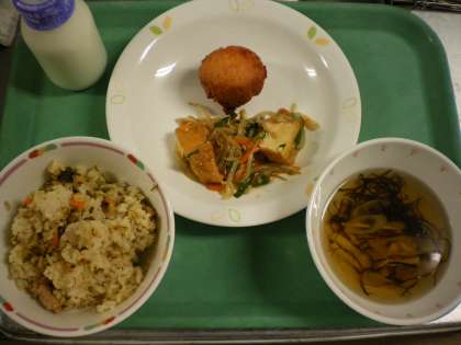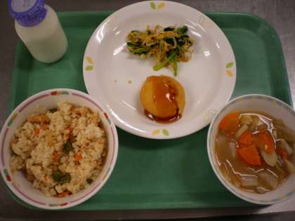 子ぎつねご飯・じゃがいももち・菊花浸し・豆腐と大根の味噌汁