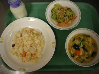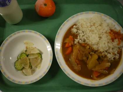 カレーライス・福神漬・きゅうりと大根のゴマ風味・冷凍ミカン