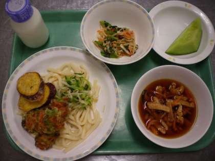 五目冷やしうどん・天ぷら(ちくわ・さつまいも)・野菜のゴマみそかけ・果物