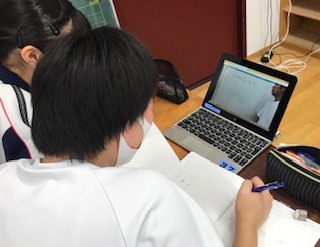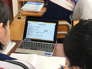 3年生の二次方程式の授業で、タブレットで説明動画を見ながら学習を進めました。