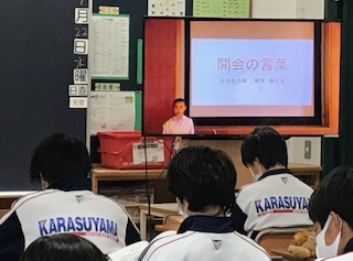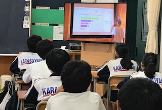 昨年のように体育館に集まって実施できません。そこで、ランチルームから各教室に動画を配信して、「SNSの危険性」「薬物の危険性」「避難経路の確認」「集団下校について」説明、確認を行いました。