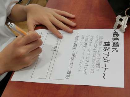 2年生の総合的な学習の時間です。9月19日(土)実施予定の職業講話のガイダンスを行いました。職業講話の説明を聞いた後、キャリア教育実行委員が作成した「話を聞いてみたい職業のアンケート」をとりました。アンケートの結果を参考にして、講師を依頼する予定です。