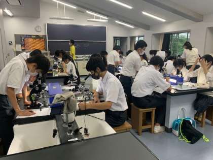 2年生、理科の様子。顕微鏡を使って、玉ねぎの表皮の細胞、オオカナダモの葉の細胞、ヒトのほおの内側の細胞の観察です。