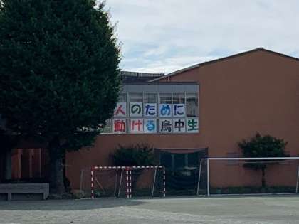 生徒会が掲げる「人のために動ける烏中生」。2階の渡り廊下に掲示されています。自分のことだけでなく、人のために何かできることはないかを考え、行動に移せることは大切ですね。