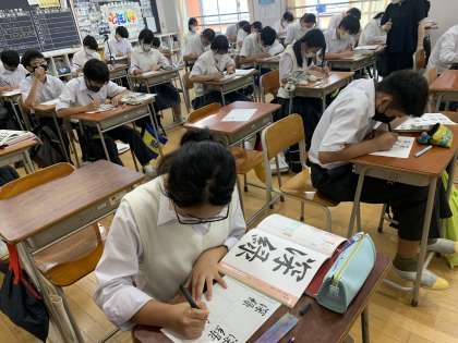 2年生、国語。筆ペンで、行書の練習をしていました。物音ひとつせず集中していました。