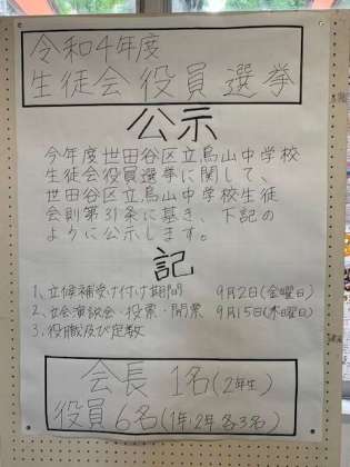 令和4年度生徒会役員選挙が公示されています。烏山中の伝統を引き継ぎつつ、新たな取り組みを進め、過ごしやすい学校づくりを進めるため、意欲的な参加を待っています。