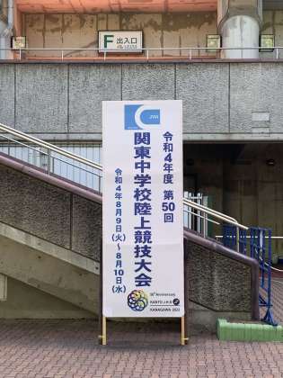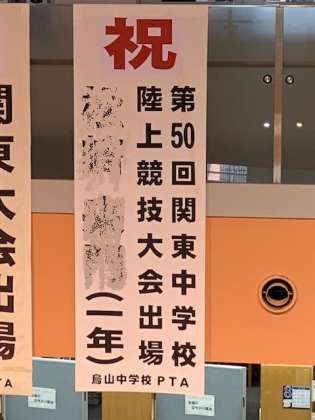 陸上部では、1年生男子が、10日(水)の陸上の関東大会に100m走で出場します。PTAより横断幕を飾っていただきました。都大会では優勝という素晴らしい結果でした。その他でもバスケットボール部、ソフトテニス部、バドミントン部が都大会に出場し、素晴らしい活躍を見せてくれています。 -