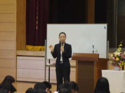 キャリアカウンセラーの工藤 倫子〈りんこ〉先生による、テーマ「子どもと一緒に考えよう、将来のこと」の講演会が行われました。生徒の興味を引きながら、わかりやすい語りで、あっというまに講演時間が過ぎてしまいました。ありがとうございました。3年生にとって将来の展望を考える大変よい機会になりました。