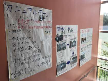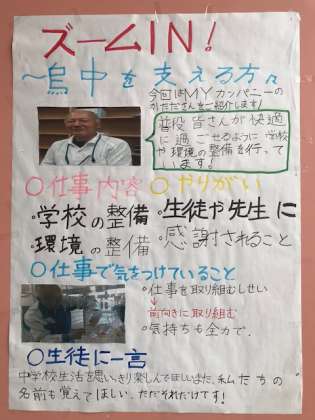 生徒会が作っている掲示物が階段踊場あたりにあります。いつも学校を綺麗にしていただいている用務さんのことやカジュアルデーについて決めたことなどが特集されています。