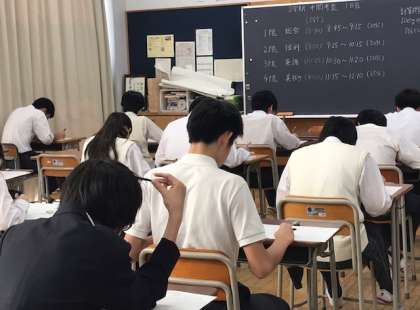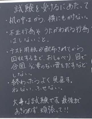 まだ二学期が始まり1ヶ月たっていないのですが、今日が中間テスト初日です。皆、真剣です。黒板には諸注意が書かれていますが、テストを真剣に取り組ませたいという担任の想いが感じられます。
