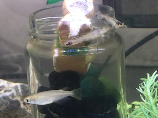 玄関を入るとたくさん水槽が並んでいます。残念ながら夏休みに暑さで生き物が減ってしまったのですが、また新しい仲間も増えました。主事さんが定期的に水を取り替え管理してくれています。