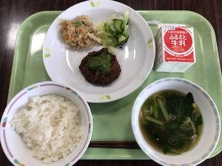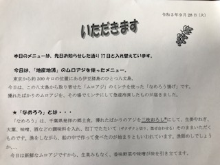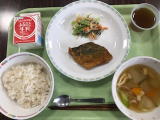 献立表では今日は、八丈島からムロ鰺を取り寄せての「なめろう揚げ」の予定でした。でも、注文締め切り時に分散登校が続くのか、通常登校に戻せるのかが確定していなかったため、28日(火)のメニューと入れ替えることになりました。そこで、今日のメインは「鯖のカレー揚げ」でしたが青魚にはDHAをはじめとする良質な油も多く含まれ、美味しくいただきました。
