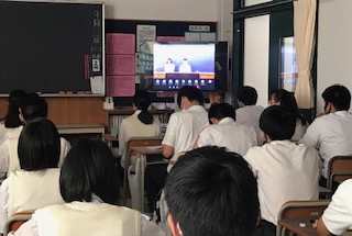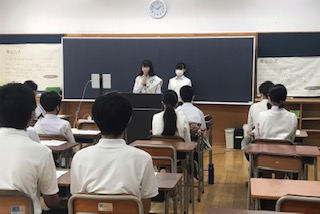 9月も後半となり、残すところ今年度もあと半年となりました。生徒会や各委員会も代替わりとなります。写真は生徒会役員立候補者による立会演説の様子と、各教室でTV画面を通して演説を聞いている様子です。