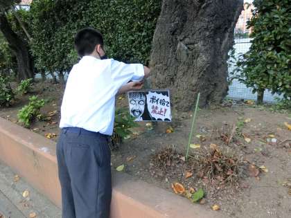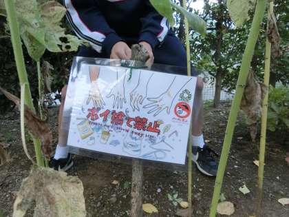 学校の周りに缶やお菓子の袋などが捨てられているので、整美委員が「ポイ捨て禁止ポスター」を掲示しました。整美委員も「これでポイ捨てする人が減るね。」と言っていたので、これでポイ捨てがなくなると嬉しいです。地域の方もご協力お願いします。
