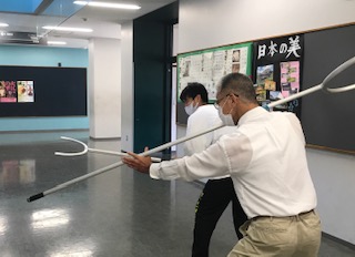不審者の確認後、放送の指示で生徒は近くの安全な教室に避難し、刺股を持った複数の職員で身の安全を確保しながら不審者を取り押さえる訓練を行いました。 -
