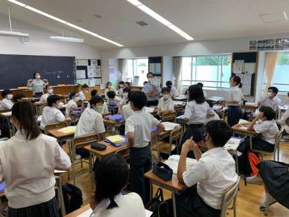 3枚目は、1年生英語。ALTの先生のジェスチャーに惑わされないように、英語の指示をよく聞いて、体を使うゲームをしていました。とても盛り上がっていました。 -