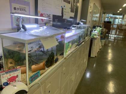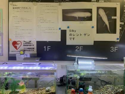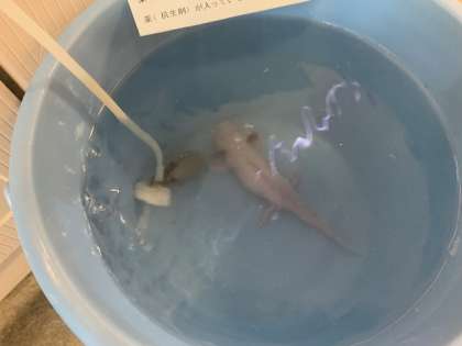 学校で飼育しているウーパールーパーの1匹が具合が悪い様子で病院に連れて行きました。戻ってきて少し回復した感じです。生徒たちも心配していました。