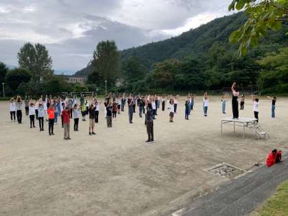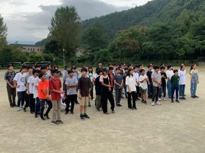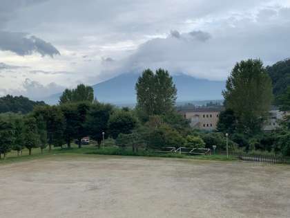おはようございます。眠そうな人もいますが元気に朝会に集合しました。今日は天気が心配ですが、富士山は少し見えています。