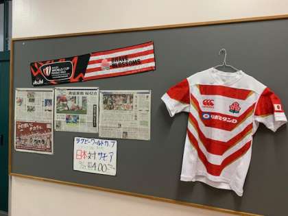 ある教室の掲示板に特設コーナーが設けられています。今日の試合に勝利し、日本代表がベスト8に1歩前進です。がんばれBrave Blossoms!