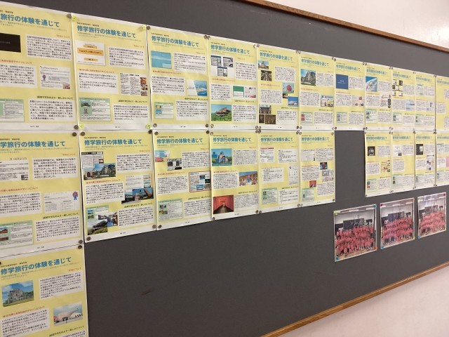 始業式では、校長から戦後80年にあたり、平和な未来に向けての話をしました。3年生の廊下には、修学旅行のまとめの新聞が掲示されています。平和にむけて一人一人が考え、どう行動するかまとめられていました。