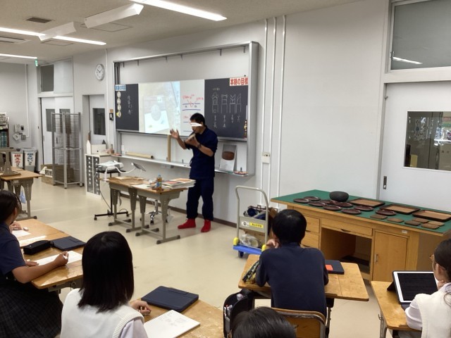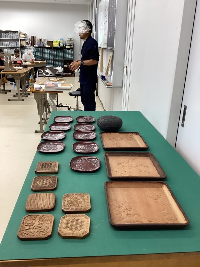 3年生の美術では、外部講師をお招きし、鎌倉彫の授業を行なっています。