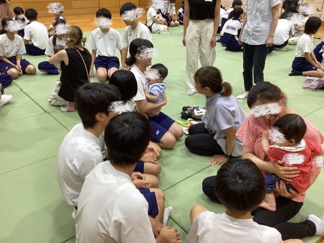 家庭科の授業では、赤ちゃん体験の授業を行なっています。本物の赤ちゃんを抱っこしたとたん大泣きされたり、恐る恐る抱っこしたりする様子があちこちで見られ、ほのぼのとした時間です。