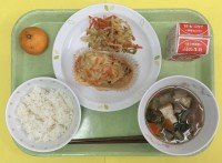 【献立】有機米ごはん、魚の味噌チーズ焼き、野菜のおかか和え、鶏ごぼう汁、みかん、牛乳魚の味噌チーズ焼きには、旬のぶりを使用しました。脂が程よく乗っており、チーズと味噌味がよく合いました。