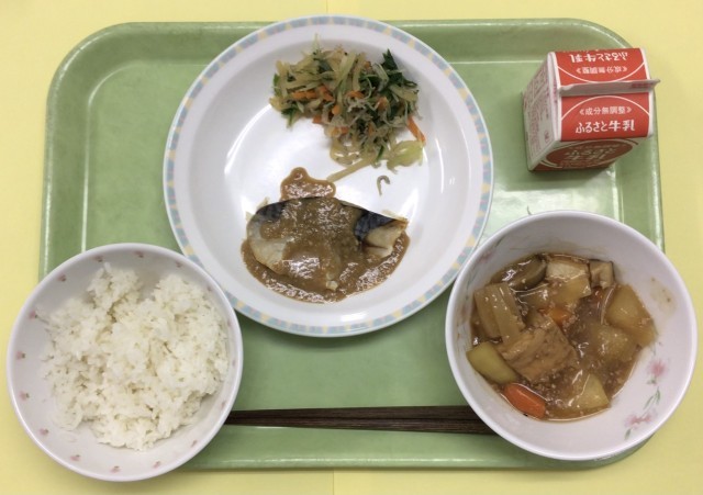 ごはん、さばのごまだれかけ、水菜とじゃこのサラダ、冬瓜のそぼろ煮、牛乳