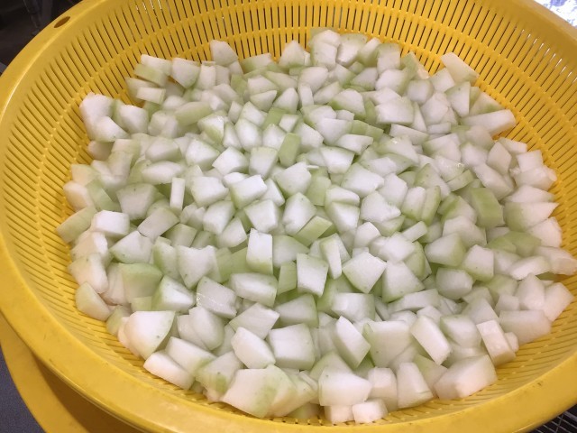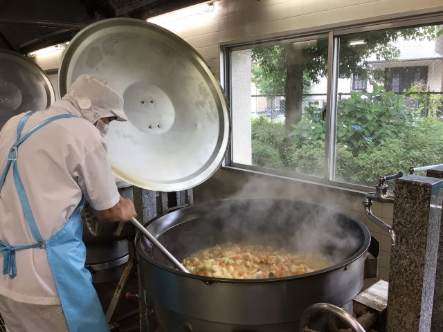 今日は旬の冬瓜をそぼろ煮にしました。冬瓜は火が通りやすいため、最後に加えます。調理員さんが加えるタイミングを見極めてちょうど良い柔らかさになるように調理してくれました。煮汁がよく染みて、白いごはんに合いました。