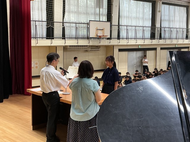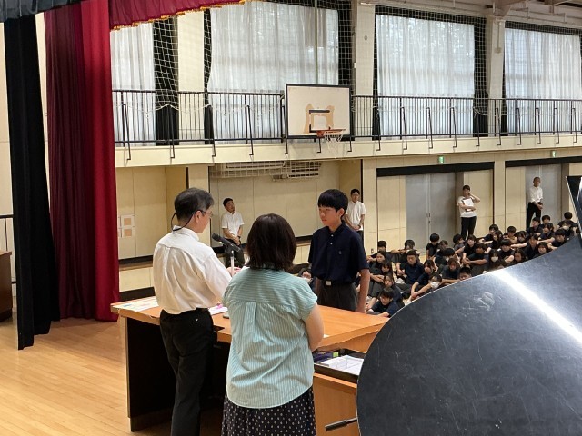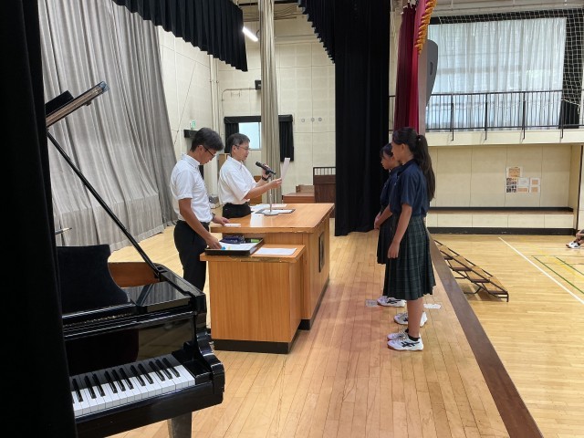 夏休み中、いろいろな場面で活躍した生徒の表彰がありました。