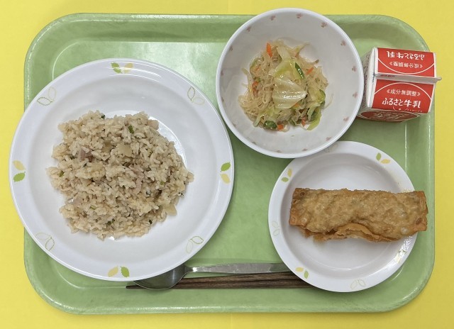 豚バラにんにくチャーハン、小松菜チーズ春巻き、バンサンスー、牛乳