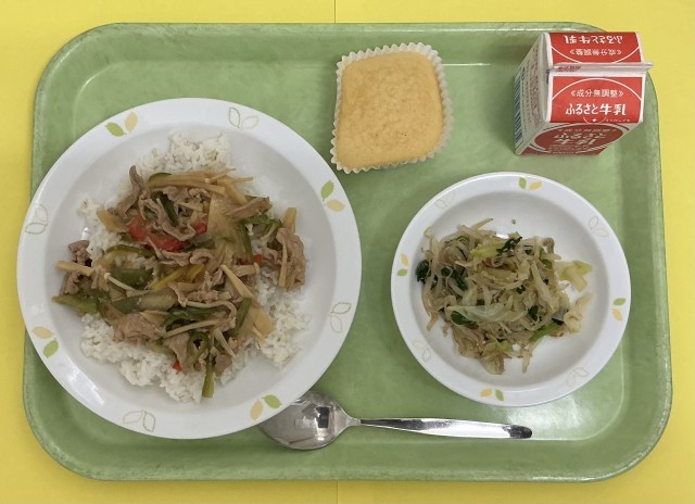 チンジャオロース丼、ねぎドレサラダ、マーラーカオ、牛乳