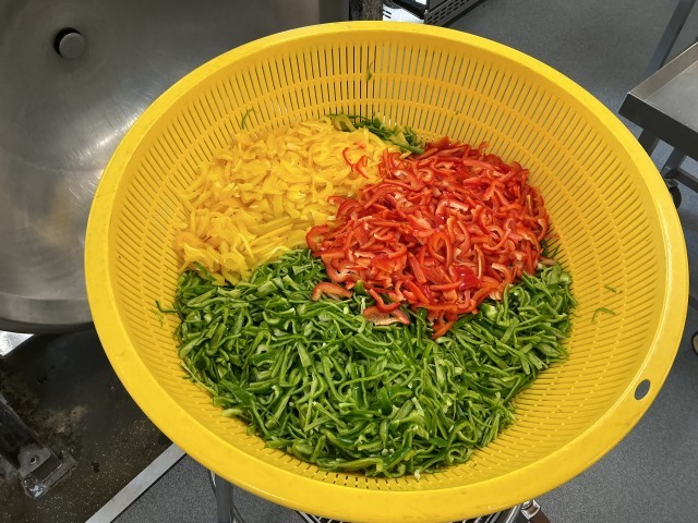 チンジャオロース丼には、3色のピーマンを使用しました。彩りよく仕上がりました。