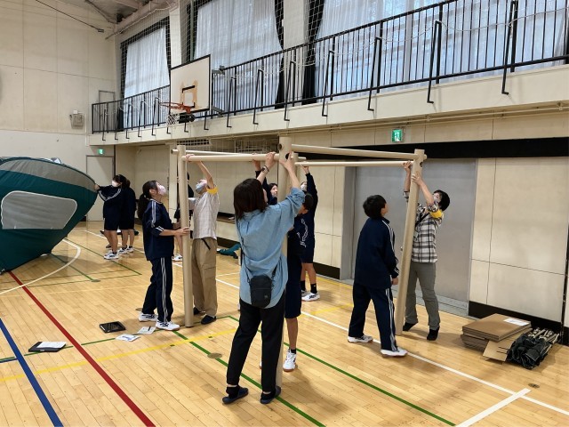 体育館で、プライバシーを守るテントを作ったり、段ボールベットを作るなど行いました。