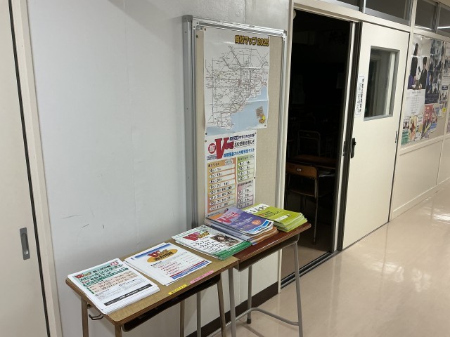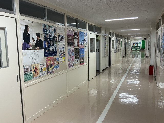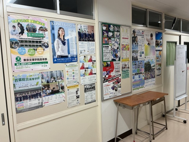 上祖師谷中学校の2階の3年生の廊下には、上級学校のポスターが掲示されていたり、受験に関する冊子が置かれています。
